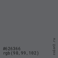 Цвет #626366 в цветовой модели RGB обозначается тремя октетами (98, 99, 102) в десятичном формате и #626366 в шестнадцатиричном (hex) формате, которые являются интенсивностью красного 98 (hex 62), интенсивность зелёного 99 (hex 63) и интенсивность синего 102 (hex 66).