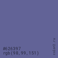 Цвет #626397 в цветовой модели RGB обозначается тремя октетами (98, 99, 151) в десятичном формате и #626397 в шестнадцатиричном (hex) формате, которые являются интенсивностью красного 98 (hex 62), интенсивность зелёного 99 (hex 63) и интенсивность синего 151 (hex 97).