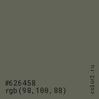 Цвет #626458 в цветовой модели RGB обозначается тремя октетами (98, 100, 88) в десятичном формате и #626458 в шестнадцатиричном (hex) формате, которые являются интенсивностью красного 98 (hex 62), интенсивность зелёного 100 (hex 64) и интенсивность синего 88 (hex 58).