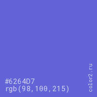 Цвет #6264D7 в цветовой модели RGB обозначается тремя октетами (98, 100, 215) в десятичном формате и #6264D7 в шестнадцатиричном (hex) формате, которые являются интенсивностью красного 98 (hex 62), интенсивность зелёного 100 (hex 64) и интенсивность синего 215 (hex D7).