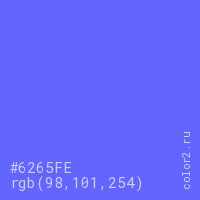 Цвет #6265FE в цветовой модели RGB обозначается тремя октетами (98, 101, 254) в десятичном формате и #6265FE в шестнадцатиричном (hex) формате, которые являются интенсивностью красного 98 (hex 62), интенсивность зелёного 101 (hex 65) и интенсивность синего 254 (hex FE).