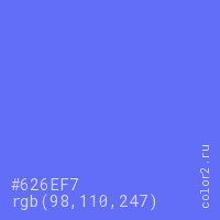 Цвет #626EF7 в цветовой модели RGB обозначается тремя октетами (98, 110, 247) в десятичном формате и #626EF7 в шестнадцатиричном (hex) формате, которые являются интенсивностью красного 98 (hex 62), интенсивность зелёного 110 (hex 6E) и интенсивность синего 247 (hex F7).