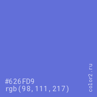 Цвет #626FD9 в цветовой модели RGB обозначается тремя октетами (98, 111, 217) в десятичном формате и #626FD9 в шестнадцатиричном (hex) формате, которые являются интенсивностью красного 98 (hex 62), интенсивность зелёного 111 (hex 6F) и интенсивность синего 217 (hex D9).