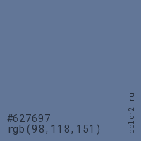 Цвет #627697 в цветовой модели RGB обозначается тремя октетами (98, 118, 151) в десятичном формате и #627697 в шестнадцатиричном (hex) формате, которые являются интенсивностью красного 98 (hex 62), интенсивность зелёного 118 (hex 76) и интенсивность синего 151 (hex 97).