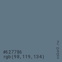 Цвет #627786 в цветовой модели RGB обозначается тремя октетами (98, 119, 134) в десятичном формате и #627786 в шестнадцатиричном (hex) формате, которые являются интенсивностью красного 98 (hex 62), интенсивность зелёного 119 (hex 77) и интенсивность синего 134 (hex 86).
