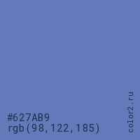 Цвет #627AB9 в цветовой модели RGB обозначается тремя октетами (98, 122, 185) в десятичном формате и #627AB9 в шестнадцатиричном (hex) формате, которые являются интенсивностью красного 98 (hex 62), интенсивность зелёного 122 (hex 7A) и интенсивность синего 185 (hex B9).