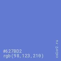 Цвет #627BD2 в цветовой модели RGB обозначается тремя октетами (98, 123, 210) в десятичном формате и #627BD2 в шестнадцатиричном (hex) формате, которые являются интенсивностью красного 98 (hex 62), интенсивность зелёного 123 (hex 7B) и интенсивность синего 210 (hex D2).