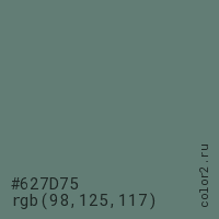 Цвет #627D75 в цветовой модели RGB обозначается тремя октетами (98, 125, 117) в десятичном формате и #627D75 в шестнадцатиричном (hex) формате, которые являются интенсивностью красного 98 (hex 62), интенсивность зелёного 125 (hex 7D) и интенсивность синего 117 (hex 75).