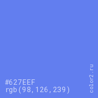 Цвет #627EEF в цветовой модели RGB обозначается тремя октетами (98, 126, 239) в десятичном формате и #627EEF в шестнадцатиричном (hex) формате, которые являются интенсивностью красного 98 (hex 62), интенсивность зелёного 126 (hex 7E) и интенсивность синего 239 (hex EF).