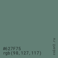 Цвет #627F75 в цветовой модели RGB обозначается тремя октетами (98, 127, 117) в десятичном формате и #627F75 в шестнадцатиричном (hex) формате, которые являются интенсивностью красного 98 (hex 62), интенсивность зелёного 127 (hex 7F) и интенсивность синего 117 (hex 75).