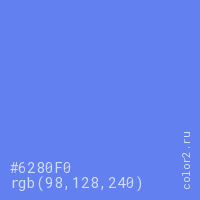 Цвет #6280F0 в цветовой модели RGB обозначается тремя октетами (98, 128, 240) в десятичном формате и #6280F0 в шестнадцатиричном (hex) формате, которые являются интенсивностью красного 98 (hex 62), интенсивность зелёного 128 (hex 80) и интенсивность синего 240 (hex F0).