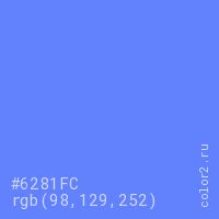 Цвет #6281FC в цветовой модели RGB обозначается тремя октетами (98, 129, 252) в десятичном формате и #6281FC в шестнадцатиричном (hex) формате, которые являются интенсивностью красного 98 (hex 62), интенсивность зелёного 129 (hex 81) и интенсивность синего 252 (hex FC).