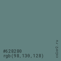 Цвет #628280 в цветовой модели RGB обозначается тремя октетами (98, 130, 128) в десятичном формате и #628280 в шестнадцатиричном (hex) формате, которые являются интенсивностью красного 98 (hex 62), интенсивность зелёного 130 (hex 82) и интенсивность синего 128 (hex 80).
