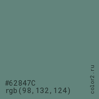 Цвет #62847C в цветовой модели RGB обозначается тремя октетами (98, 132, 124) в десятичном формате и #62847C в шестнадцатиричном (hex) формате, которые являются интенсивностью красного 98 (hex 62), интенсивность зелёного 132 (hex 84) и интенсивность синего 124 (hex 7C).