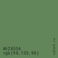 Цвет #62855A в цветовой модели RGB обозначается тремя октетами (98, 133, 90) в десятичном формате и #62855A в шестнадцатиричном (hex) формате, которые являются интенсивностью красного 98 (hex 62), интенсивность зелёного 133 (hex 85) и интенсивность синего 90 (hex 5A).