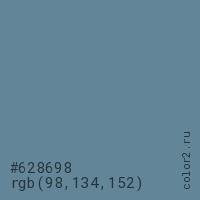 Цвет #628698 в цветовой модели RGB обозначается тремя октетами (98, 134, 152) в десятичном формате и #628698 в шестнадцатиричном (hex) формате, которые являются интенсивностью красного 98 (hex 62), интенсивность зелёного 134 (hex 86) и интенсивность синего 152 (hex 98).
