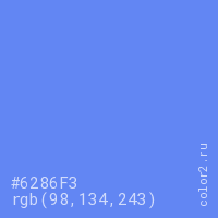 Цвет #6286F3 в цветовой модели RGB обозначается тремя октетами (98, 134, 243) в десятичном формате и #6286F3 в шестнадцатиричном (hex) формате, которые являются интенсивностью красного 98 (hex 62), интенсивность зелёного 134 (hex 86) и интенсивность синего 243 (hex F3).