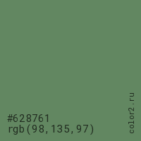 Цвет #628761 в цветовой модели RGB обозначается тремя октетами (98, 135, 97) в десятичном формате и #628761 в шестнадцатиричном (hex) формате, которые являются интенсивностью красного 98 (hex 62), интенсивность зелёного 135 (hex 87) и интенсивность синего 97 (hex 61).