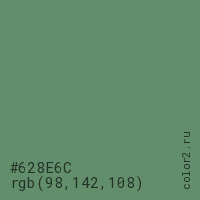 Цвет #628E6C в цветовой модели RGB обозначается тремя октетами (98, 142, 108) в десятичном формате и #628E6C в шестнадцатиричном (hex) формате, которые являются интенсивностью красного 98 (hex 62), интенсивность зелёного 142 (hex 8E) и интенсивность синего 108 (hex 6C).