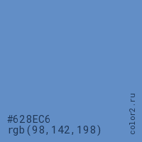Цвет #628EC6 в цветовой модели RGB обозначается тремя октетами (98, 142, 198) в десятичном формате и #628EC6 в шестнадцатиричном (hex) формате, которые являются интенсивностью красного 98 (hex 62), интенсивность зелёного 142 (hex 8E) и интенсивность синего 198 (hex C6).