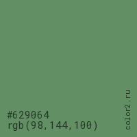 Цвет #629064 в цветовой модели RGB обозначается тремя октетами (98, 144, 100) в десятичном формате и #629064 в шестнадцатиричном (hex) формате, которые являются интенсивностью красного 98 (hex 62), интенсивность зелёного 144 (hex 90) и интенсивность синего 100 (hex 64).