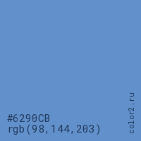 Цвет #6290CB в цветовой модели RGB обозначается тремя октетами (98, 144, 203) в десятичном формате и #6290CB в шестнадцатиричном (hex) формате, которые являются интенсивностью красного 98 (hex 62), интенсивность зелёного 144 (hex 90) и интенсивность синего 203 (hex CB).