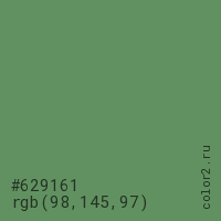 Цвет #629161 в цветовой модели RGB обозначается тремя октетами (98, 145, 97) в десятичном формате и #629161 в шестнадцатиричном (hex) формате, которые являются интенсивностью красного 98 (hex 62), интенсивность зелёного 145 (hex 91) и интенсивность синего 97 (hex 61).