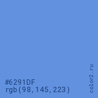 Цвет #6291DF в цветовой модели RGB обозначается тремя октетами (98, 145, 223) в десятичном формате и #6291DF в шестнадцатиричном (hex) формате, которые являются интенсивностью красного 98 (hex 62), интенсивность зелёного 145 (hex 91) и интенсивность синего 223 (hex DF).