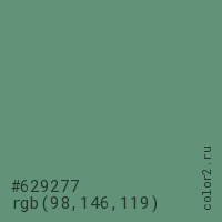 Цвет #629277 в цветовой модели RGB обозначается тремя октетами (98, 146, 119) в десятичном формате и #629277 в шестнадцатиричном (hex) формате, которые являются интенсивностью красного 98 (hex 62), интенсивность зелёного 146 (hex 92) и интенсивность синего 119 (hex 77).