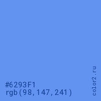 Цвет #6293F1 в цветовой модели RGB обозначается тремя октетами (98, 147, 241) в десятичном формате и #6293F1 в шестнадцатиричном (hex) формате, которые являются интенсивностью красного 98 (hex 62), интенсивность зелёного 147 (hex 93) и интенсивность синего 241 (hex F1).