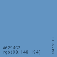 Цвет #6294C2 в цветовой модели RGB обозначается тремя октетами (98, 148, 194) в десятичном формате и #6294C2 в шестнадцатиричном (hex) формате, которые являются интенсивностью красного 98 (hex 62), интенсивность зелёного 148 (hex 94) и интенсивность синего 194 (hex C2).