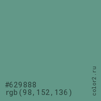 Цвет #629888 в цветовой модели RGB обозначается тремя октетами (98, 152, 136) в десятичном формате и #629888 в шестнадцатиричном (hex) формате, которые являются интенсивностью красного 98 (hex 62), интенсивность зелёного 152 (hex 98) и интенсивность синего 136 (hex 88).