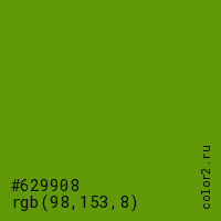 Цвет #629908 в цветовой модели RGB обозначается тремя октетами (98, 153, 8) в десятичном формате и #629908 в шестнадцатиричном (hex) формате, которые являются интенсивностью красного 98 (hex 62), интенсивность зелёного 153 (hex 99) и интенсивность синего 8 (hex 08).