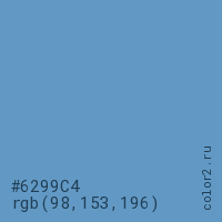 Цвет #6299C4 в цветовой модели RGB обозначается тремя октетами (98, 153, 196) в десятичном формате и #6299C4 в шестнадцатиричном (hex) формате, которые являются интенсивностью красного 98 (hex 62), интенсивность зелёного 153 (hex 99) и интенсивность синего 196 (hex C4).