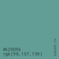 Цвет #629D96 в цветовой модели RGB обозначается тремя октетами (98, 157, 150) в десятичном формате и #629D96 в шестнадцатиричном (hex) формате, которые являются интенсивностью красного 98 (hex 62), интенсивность зелёного 157 (hex 9D) и интенсивность синего 150 (hex 96).