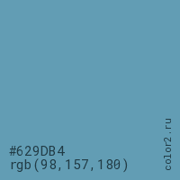 Цвет #629DB4 в цветовой модели RGB обозначается тремя октетами (98, 157, 180) в десятичном формате и #629DB4 в шестнадцатиричном (hex) формате, которые являются интенсивностью красного 98 (hex 62), интенсивность зелёного 157 (hex 9D) и интенсивность синего 180 (hex B4).