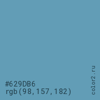 Цвет #629DB6 в цветовой модели RGB обозначается тремя октетами (98, 157, 182) в десятичном формате и #629DB6 в шестнадцатиричном (hex) формате, которые являются интенсивностью красного 98 (hex 62), интенсивность зелёного 157 (hex 9D) и интенсивность синего 182 (hex B6).