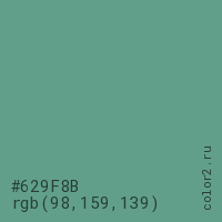 Цвет #629F8B в цветовой модели RGB обозначается тремя октетами (98, 159, 139) в десятичном формате и #629F8B в шестнадцатиричном (hex) формате, которые являются интенсивностью красного 98 (hex 62), интенсивность зелёного 159 (hex 9F) и интенсивность синего 139 (hex 8B).