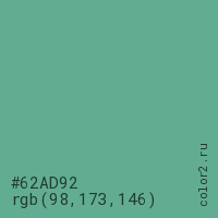 Цвет #62AD92 в цветовой модели RGB обозначается тремя октетами (98, 173, 146) в десятичном формате и #62AD92 в шестнадцатиричном (hex) формате, которые являются интенсивностью красного 98 (hex 62), интенсивность зелёного 173 (hex AD) и интенсивность синего 146 (hex 92).