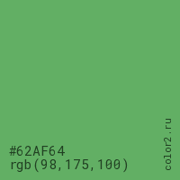 Цвет #62AF64 в цветовой модели RGB обозначается тремя октетами (98, 175, 100) в десятичном формате и #62AF64 в шестнадцатиричном (hex) формате, которые являются интенсивностью красного 98 (hex 62), интенсивность зелёного 175 (hex AF) и интенсивность синего 100 (hex 64).