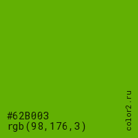 Цвет #62B003 в цветовой модели RGB обозначается тремя октетами (98, 176, 3) в десятичном формате и #62B003 в шестнадцатиричном (hex) формате, которые являются интенсивностью красного 98 (hex 62), интенсивность зелёного 176 (hex B0) и интенсивность синего 3 (hex 03).