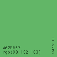 Цвет #62B667 в цветовой модели RGB обозначается тремя октетами (98, 182, 103) в десятичном формате и #62B667 в шестнадцатиричном (hex) формате, которые являются интенсивностью красного 98 (hex 62), интенсивность зелёного 182 (hex B6) и интенсивность синего 103 (hex 67).