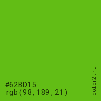 Цвет #62BD15 в цветовой модели RGB обозначается тремя октетами (98, 189, 21) в десятичном формате и #62BD15 в шестнадцатиричном (hex) формате, которые являются интенсивностью красного 98 (hex 62), интенсивность зелёного 189 (hex BD) и интенсивность синего 21 (hex 15).