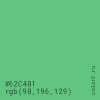 Цвет #62C481 в цветовой модели RGB обозначается тремя октетами (98, 196, 129) в десятичном формате и #62C481 в шестнадцатиричном (hex) формате, которые являются интенсивностью красного 98 (hex 62), интенсивность зелёного 196 (hex C4) и интенсивность синего 129 (hex 81).