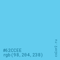 Цвет #62CCEE в цветовой модели RGB обозначается тремя октетами (98, 204, 238) в десятичном формате и #62CCEE в шестнадцатиричном (hex) формате, которые являются интенсивностью красного 98 (hex 62), интенсивность зелёного 204 (hex CC) и интенсивность синего 238 (hex EE).