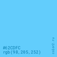 Цвет #62CDFC в цветовой модели RGB обозначается тремя октетами (98, 205, 252) в десятичном формате и #62CDFC в шестнадцатиричном (hex) формате, которые являются интенсивностью красного 98 (hex 62), интенсивность зелёного 205 (hex CD) и интенсивность синего 252 (hex FC).