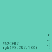 Цвет #62CFB7 в цветовой модели RGB обозначается тремя октетами (98, 207, 183) в десятичном формате и #62CFB7 в шестнадцатиричном (hex) формате, которые являются интенсивностью красного 98 (hex 62), интенсивность зелёного 207 (hex CF) и интенсивность синего 183 (hex B7).