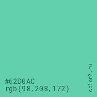 Цвет #62D0AC в цветовой модели RGB обозначается тремя октетами (98, 208, 172) в десятичном формате и #62D0AC в шестнадцатиричном (hex) формате, которые являются интенсивностью красного 98 (hex 62), интенсивность зелёного 208 (hex D0) и интенсивность синего 172 (hex AC).