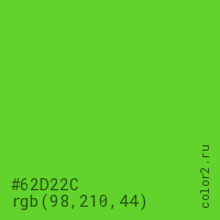 Цвет #62D22C в цветовой модели RGB обозначается тремя октетами (98, 210, 44) в десятичном формате и #62D22C в шестнадцатиричном (hex) формате, которые являются интенсивностью красного 98 (hex 62), интенсивность зелёного 210 (hex D2) и интенсивность синего 44 (hex 2C).