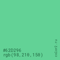 Цвет #62D296 в цветовой модели RGB обозначается тремя октетами (98, 210, 150) в десятичном формате и #62D296 в шестнадцатиричном (hex) формате, которые являются интенсивностью красного 98 (hex 62), интенсивность зелёного 210 (hex D2) и интенсивность синего 150 (hex 96).